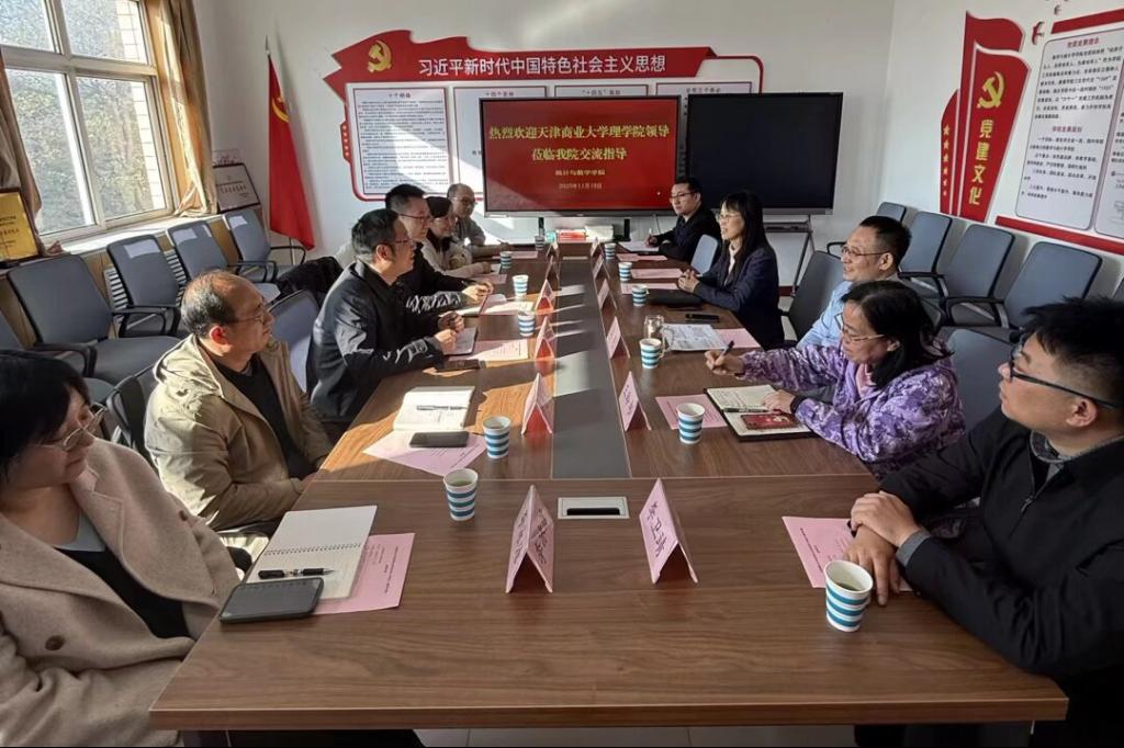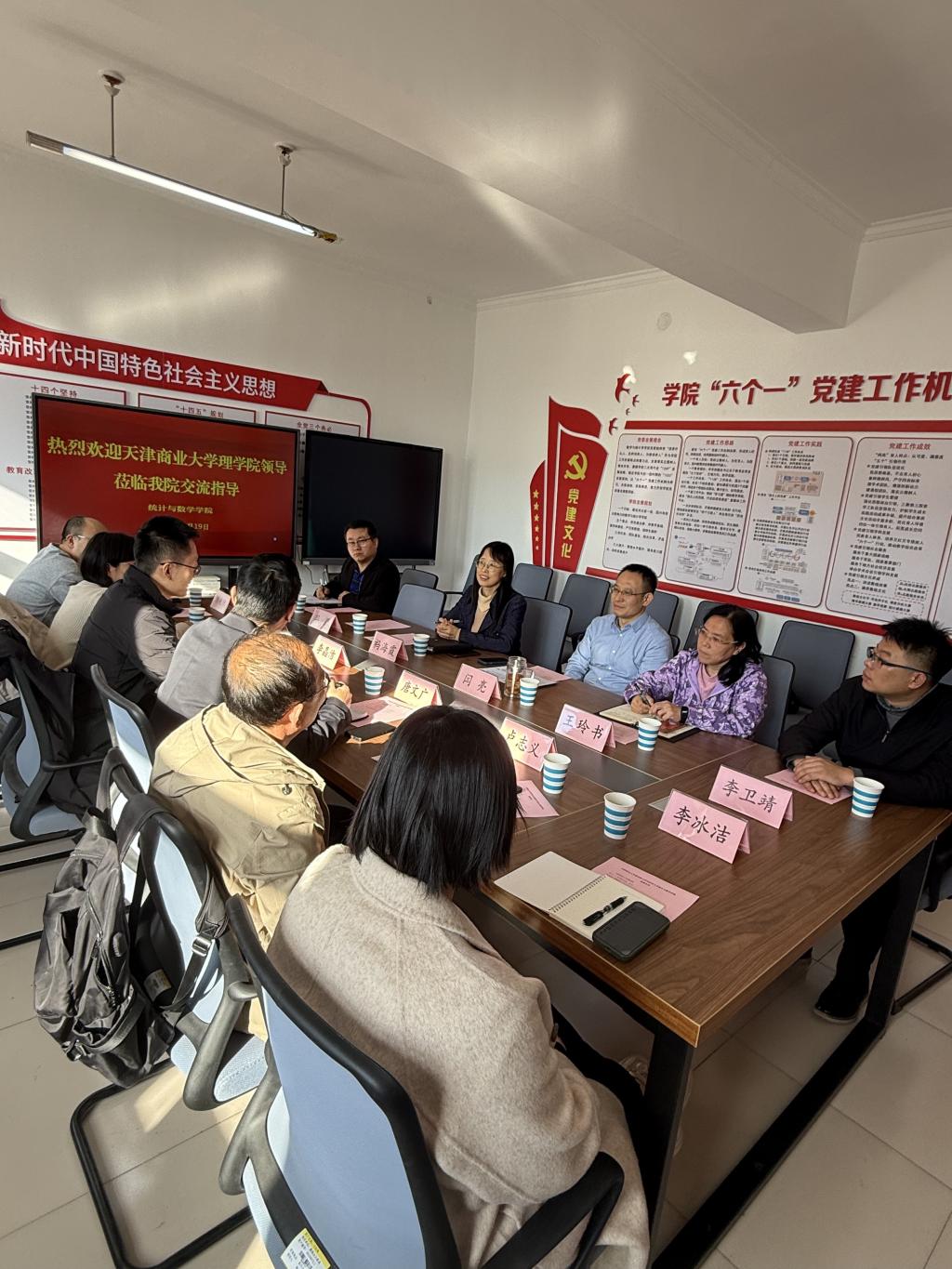 11月19日,天津商业大学理学院党委副书记、院长唐文广带领副院长李晶洁,统计系党支部书记、系主任卢志义,计算与金融数学党支部书记、系主任李景焕,统计系副主任刘兆阳,办公室党支部书记、教学办公室主任李冰洁一行到访304am永利集团。学院党委书记祃海霞,院长闫亮,党委副书记路荣,副院长王玲书、张良勇,统计系党支部书记、系主任李卫靖与到访嘉宾围绕党建品牌创建、党建与业务融合、学科建设与教育教学改革开展等进行了专题交流座谈。