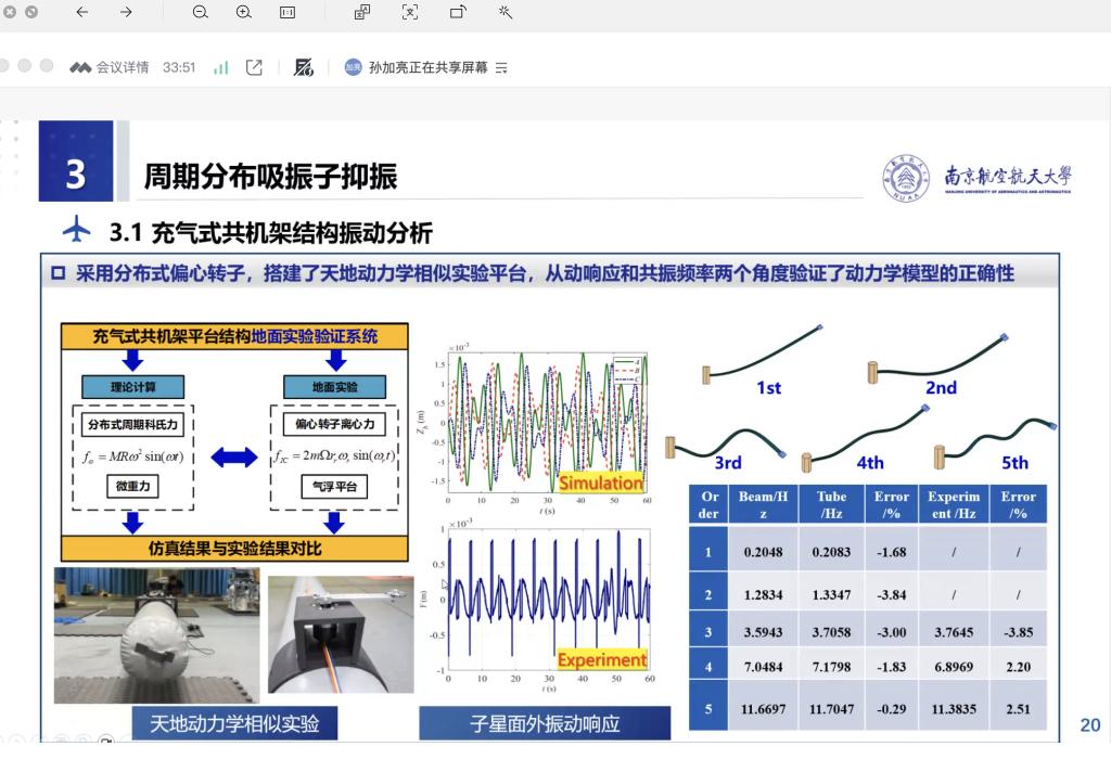 报告最后,孙加亮副教授提到,团队通过有限元仿真计算与地面实验双重验证,证实上述三项减振方法切实可行、效果显著,能够满足光学成像的高精度稳定要求,相关成果为该类空间结构的工程设计与在轨应用提供了重要理论与技术支撑。