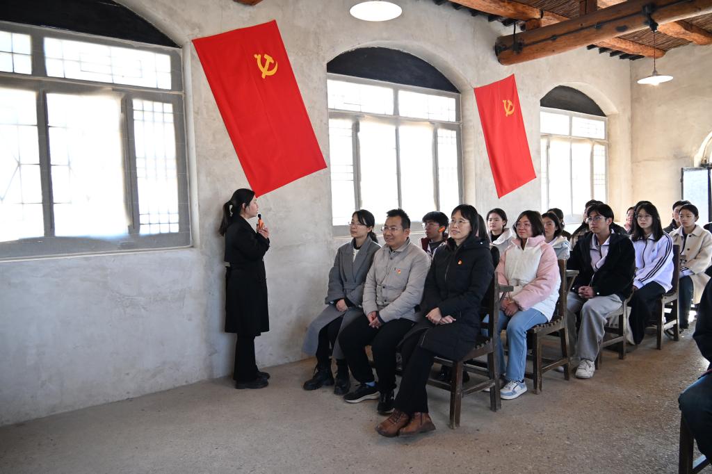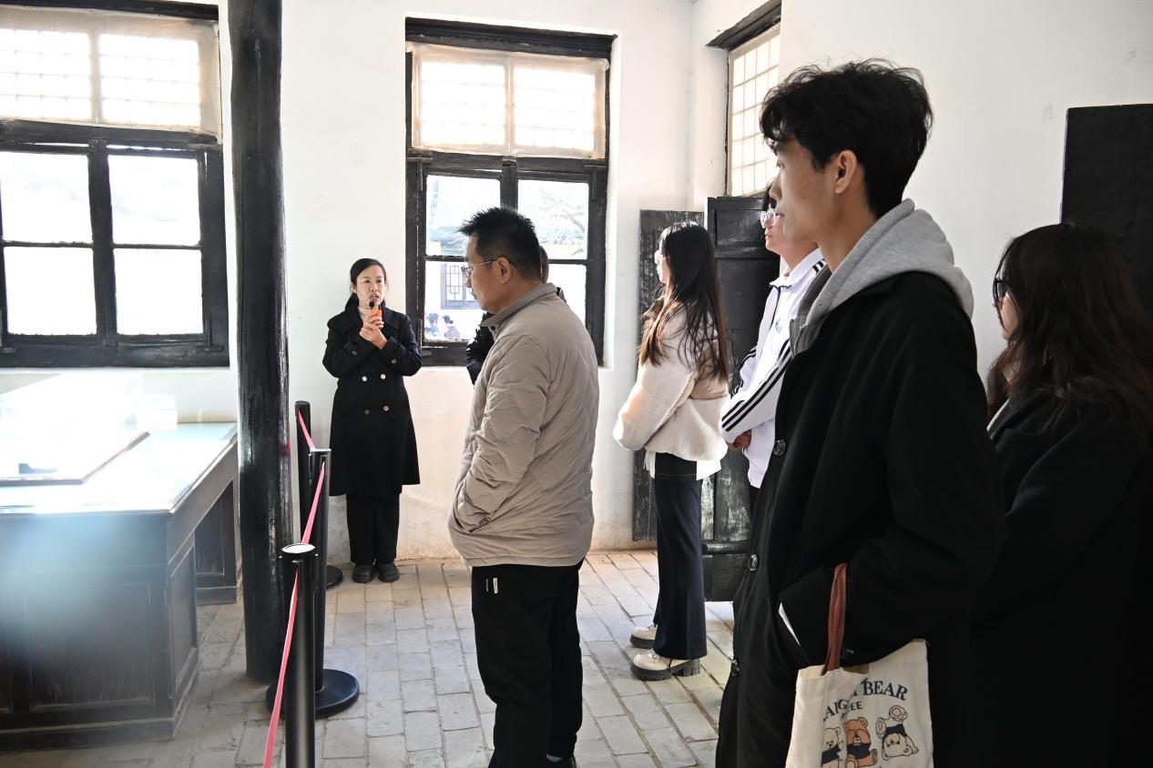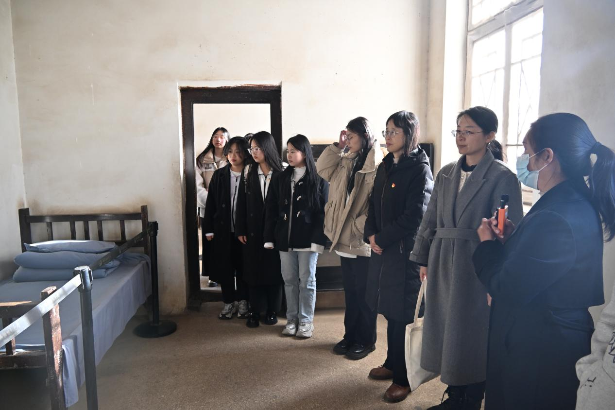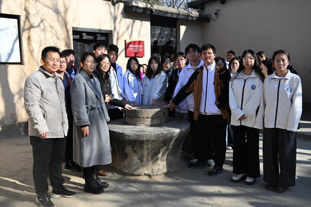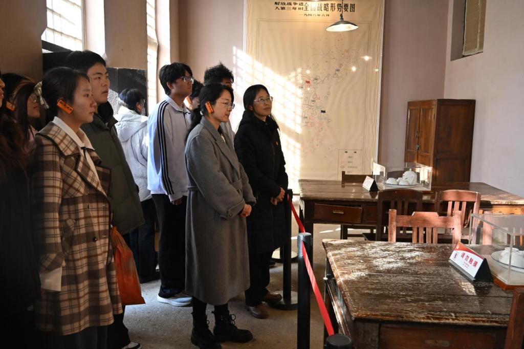 在西柏坡中共中央旧址,全体成员跟随讲解,依次瞻仰了毛泽东、朱德、刘少奇、周恩来、任弼时、董必武等老一辈革命家的旧居以及军委作战室、新华社旧址等地。泥砖砌筑的平房、斑驳的桌椅、红蓝毛线标注的作战地图……每一处历史痕迹都令人驻足凝思、心潮起伏。师生们还在七届二中全会旧址亲身感受会场氛围,深切体会中国革命胜利的来之不易。